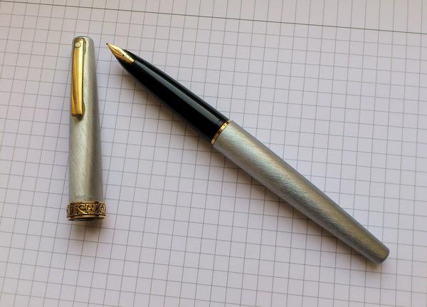 Приехала из Британии Lady Sheaffer 620XG, состояние NOS, только без конвертера. Обошлась с доставкой в GBP 28.97. Перо золотое, 14К. Пишет чуть тоньше пера F империала, но не так гладко. Хотя может на моём империале перо уже расписанное.
