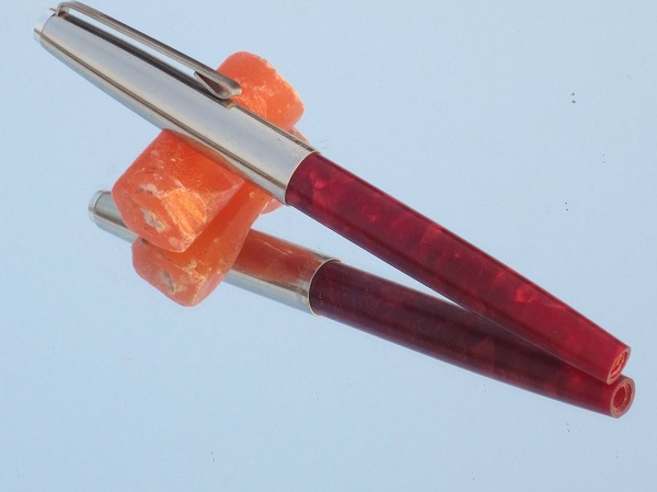 Целлулоидный корпус красиво переливается на свету, при этом очень прочный. Вес 15 грамм, длина с колпачком 138мм, длина без колпачка 122мм, диаметр в самом толстом месте 11мм.