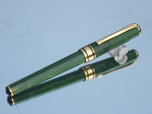 Толстая мужская ручка с откручивающимся колпачком. Довольно легкая для своего размера, приятно располагается в руке. Корпус пластиковый, зеленый с мраморными разводами. Вес 19грамм, длина 135см, диаметр 10мм.