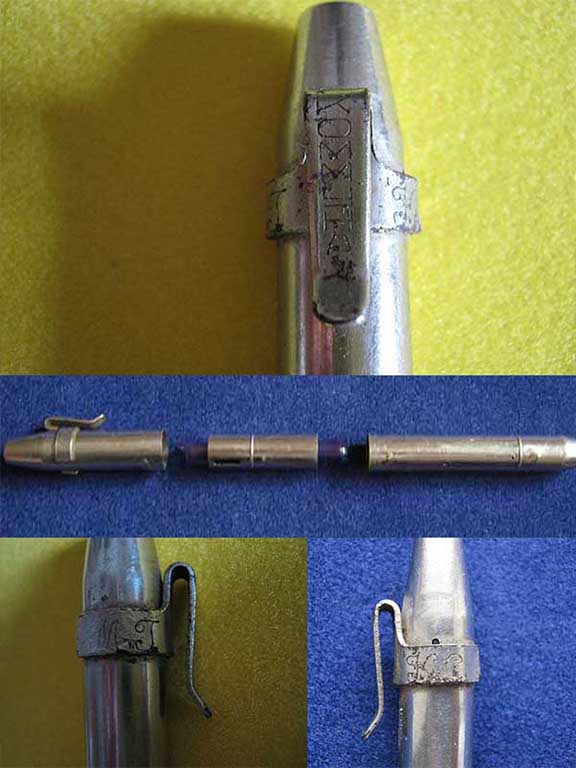 Да. На зажиме вертикальная надпись КОММУНА. Надпись АРТ расположена горизонтально на изгибе зажима. Слова Парижская нигде нет.Корпус выполнен из желтого металла с покрытием. Зажим стальной с покрытием. Перо к сожалению отсутствует. Из внутренностей только стеклянный баллончик со следами чернила внутри. На полоске крепления зажима к колпачку слева и справа есть не переплетающийся вензель, который видно на фото. Интересно его расшифровать. Кроме этого хотелось бы знать где и когда такие авторучки производились.