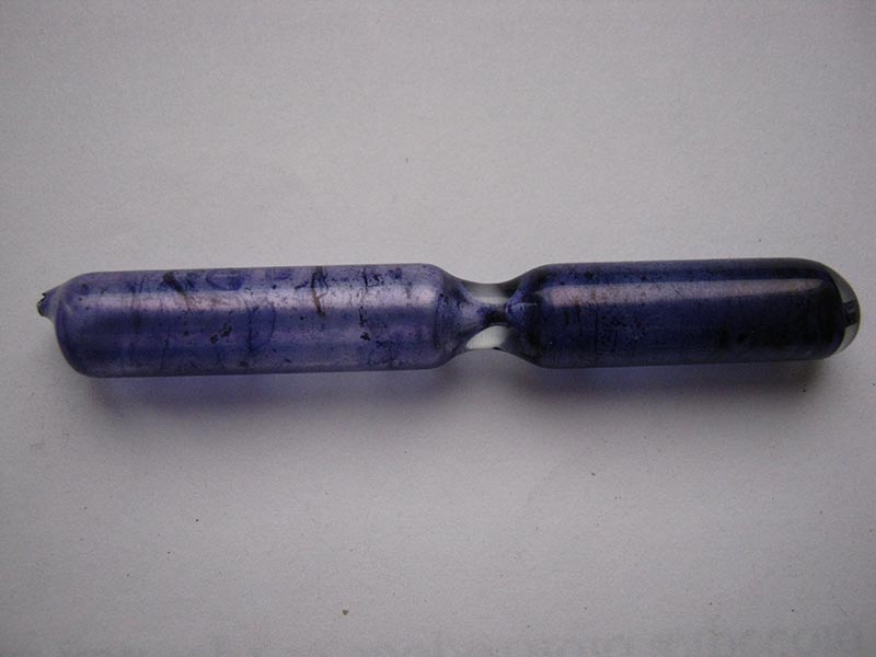 Баллончик стеклянный. Со стороны пера трубка сломана. С противоположной стороны имеется отверстие малого диаметра. Приблизительно по середине сделано сужение диаметра, как у термометров.