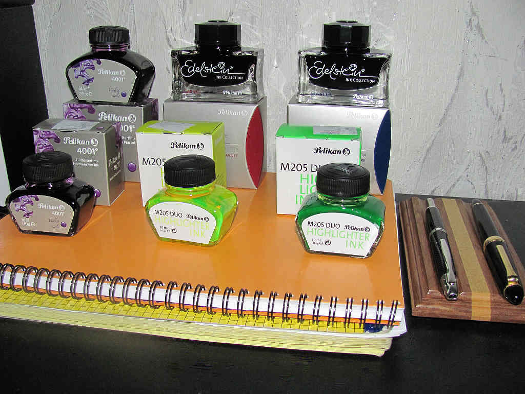 Не могу не поделиться очередным приобретением. Вчера получил в собрание чернила Pelikan ( огромное спасибо нашему молдавскому дилеру "STAVROPOLI -COMPANIE"). Фиолетовые в разных объёмах с новой этикеткой, Edelstein Sapphire и Garnet, а также Pelikan M205 Duo highlighter двух цветов. Изумили последние, поэтому сразу протестировал.Интересные чернила. Особенно необычно ведут себя на мелованной бумаге. Вы видели красочные неоновые огоньки в сумерках? Так вот, это один в один,но в светлое время суток и на глянцевой кристально белой бумаге. Я бы эти чернила назвал неоновыми. Везёт нам,любителям перьевых ручек и чернил в Молдавии, всегда партнёр привезёт быстро и дёшево,главное оперативно подать заявку. За 6 флаконов разных чернил заплатил с доставкой,растаможкой и наценкой всего 28,5 евро. Edelstein буду тестировать позже.