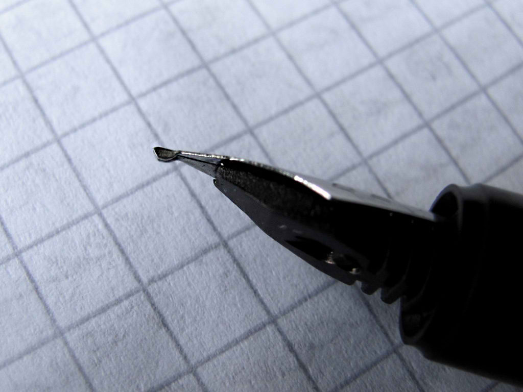 Вволю нарассмартивавшись, натрогавшись и наигравшись корпусом, пришло время заправки ручки чернилами и пробы в деле этого во всем приятного предмета. Тем более, что в комплект входят два картриджа. Система заправки ручки картриджно-конвертерная формата international. Хотя по поводу конвертеров сильно сомневаюсь, поскольку место на «дне» барреля ещё явно есть, но какой international-конвертер туда поместится сказать не могу, так как у меня такого не нашлось. Точно могу сказать лишь, что длинные пеликановские international-картриджи в баррель не входят по причине их большей, чем необходимо, длины. Заправив картридж и полюбовавшись, как чернила заполняют грипп-секцию, прикоснулась пером к бумаге… И… здесь меня ждал первый и единственный сюрприз. Немного привыкнув к поведению немногочисленных европейцев и японцев при первой заправке, я ожидала, что перо сразу начнёт писать. Ан, не тут-то было! Перо писать отказалось, видимо, возгордившись от моих предыдущих дифирамбов. Однако опыт по реанимированию ручек уже накоплен за то время, что перо не выходит из моих рук в силу специфики профессии, поэтому сначала я попробовала разобрать ручку, но из этой затеи ничего не вышло: побоялась просто сломать грипп излишними усилиями. Тогда, недолго думая, пошла и промыла её обыкновенной водой под давлением, т.е. с помощью шприца. После этой процедуры ручка записала, как миленькая. По всей видимости, мне попался экземпляр с частичками пылинок-соринок в воздушных полостях фидера, которые необходимо было прочистить. Когда же ручка записала я снова обрадовалась, потому что у неё оказалось лёгкое, достаточно гладкое перо, не царапающее бумагу. Конечно, это не золотое перо soft или flex, хотя и немного упругое. Но от него и не требуется за такие деньги особо много. Главное, чтобы писало надёжно, без пропусков и было красиво, несмотря на то, что простое стальное. Меня, честно сказать, ещё на стадии выбора порадовали форма и размеры пёрышка. Всё как-то настолько гармонично, что ручку хочется держать в руках. Перо по форме сделано с классическими изгибами и заужением к кончику, которое выполнено будто кончик сплюснули, образовав шарик. В профиль этот шарик смотрится несколько тяжеловесно, но это замечательно компенсируется формой и размерами фидера под пишущей частью пера.