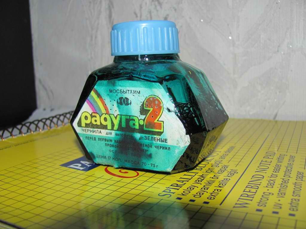 О, и я тоже сегодня посетил блошиный рынок. За 20 центов приобрёл в собрание чернила советской эпохи. Чернила зелёные, других не было, но цвет такой весёленький.Был ещё стеклянный круглый флакон " TINT",произведено в Эстонии в годы Союза. Написано на двух языках. Цена 12 копеек, чернила "Радуга". Ни разу не видел такие раньше. Но старьёвщик цену высокую заломил,пусть у него ещё с годик полежит,тогда может поймёт,что им красная цена 1$, не больше (у нас в Молдавии).Ну и ручек немного прикупил в собрание,но об этом в другой теме напишу позже.