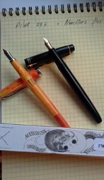 Pilot 78G с пером F с упаковкой черных картриджей (без одного) ну и стандартным пипеточным конвертором (в него не заправляла)- 650 рублей включая доставку. После покупки валялась дома, перо нормальное для повседневных записей (обычное, не для поиграться), но этот старомодный плассмассовый корпус с крутилкой совсем не вызвал желания ей пользоваться...