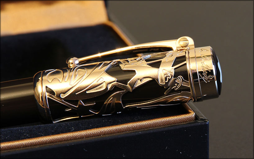 Предлагаю Вашему вниманию перьевую ручку Montblanc Carlo Collodi, которая увидела свет в 2011 году и была выпушена тиражом в 12000 экземпляров. Ручка имеет поршневую систему заправки и снабжена пером из 18-ти каратного золота. Подача чернил обильная и линия получается широкой, но уже чем у имеющегося Montblanc Chopin c пером М. Поэтому размер пера предположительно F.