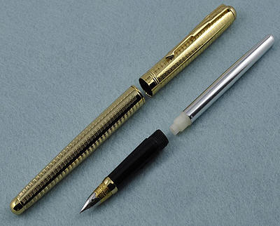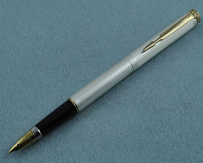 Очень редкая ручка с закрытым пером F, корпус пластик, колпачек — металл, заправка — пипетка.