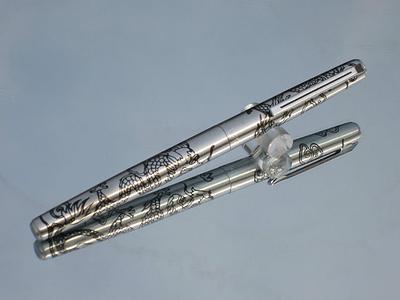 Тяжелая сигарообразная ручка для настоящих мужчин в металлическом корпусе с резным орнаментом. Выглядит на миллион. Перо открытое F–M, ближе к европейскому F из стали с иридиевым наконечником. Заправка пипеткой.