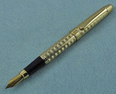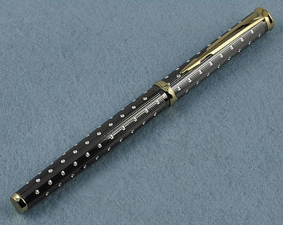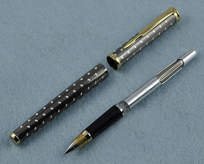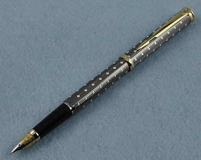 Тяжелая сигарообразная ручка для настоящих мужчин в металлическом корпусе с резным орнаментом. Выглядит на миллион. Перо открытое F–M, ближе к европейскому F из стали с иридиевым наконечником. Заправка пипеткой.