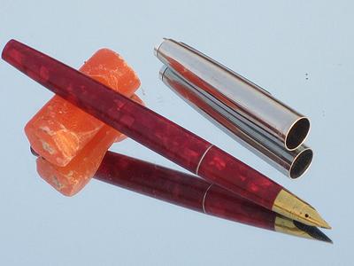 Классическая ручка из целлулоида с металлическим колпачком. Перо — открытое, сталь с иридиевым наконечником, F. Заправка - пипетка.