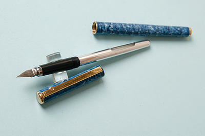 Классическая ручка из целлулоида с металлическим колпачком. Перо — открытое, сталь с иридиевым наконечником, F. Заправка - пипетка.