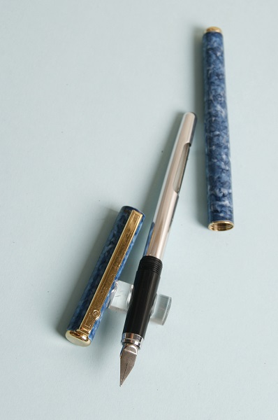 Классическая ручка из целлулоида с металлическим колпачком. Перо — открытое, сталь с иридиевым наконечником, F. Заправка - пипетка.