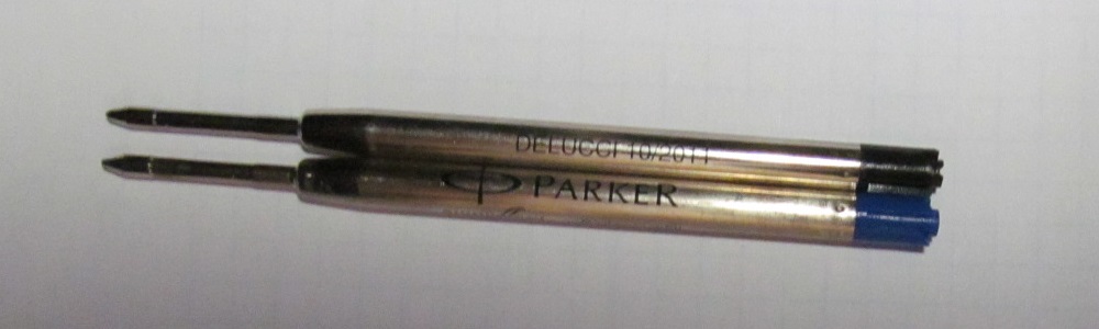 Любопытное дело выяснил в прошедшую субботу. Оказывается не все Паркеровские ("толстые", "объемные") стержни одинаковы. Стандарт китайцами не выдерживается. Стержни в мною купленной шариковой ручке Delucci имеют меньший диаметр, чем фирменные от Паркера (см. фото). Причём и диаметр втулки у ручки так подогнан под этот, меньшего диаметра стержень, что при попытке вставить чисто паркеровкий стержень, он в районе развальцовки для верхнего пластмассового концевика соприкасается с внутренней стенкой корпуса. И трение при вращении (для возврата в нерабочее положение) таково, что препятствует удалению пишущего узла в корпус. Короче — купленная мною китайская ручка плохо приспособлена для использования фирменных картриджей! На фото заметна разница в диаметрах. Под рукой нет штангенциркуля, а то бы привёл замеры диаметров. Можно ли предполагать, что это сделано для китайского пользования сознательно, чтобы говорить, что мы, мол, делаем другие картриджи, не сворованные?