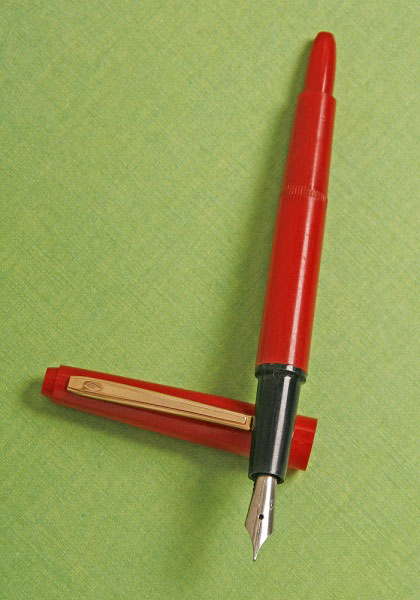 Классическая ручка из целлулоида с металлическим колпачком. Перо — открытое, сталь с иридиевым наконечником, F. Заправка - пипетка.