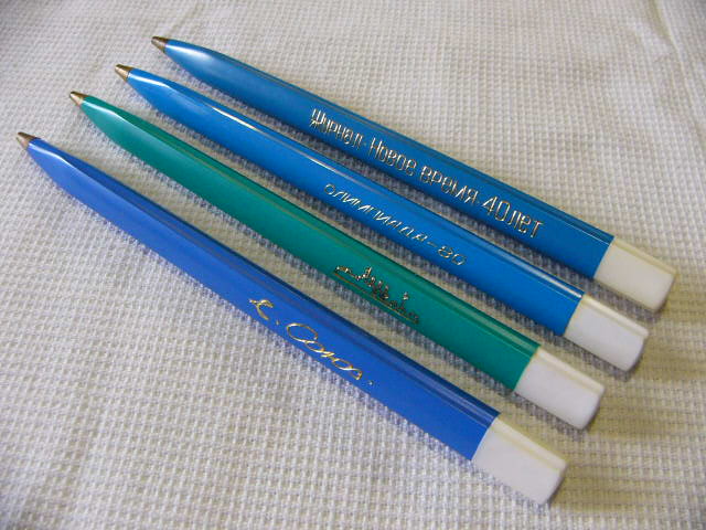 Цвета авторучек: одна зелёная с изображением Авроры и три синие: Олимпиада-80, Аврора, Журнал "Новое время" 40 лет.