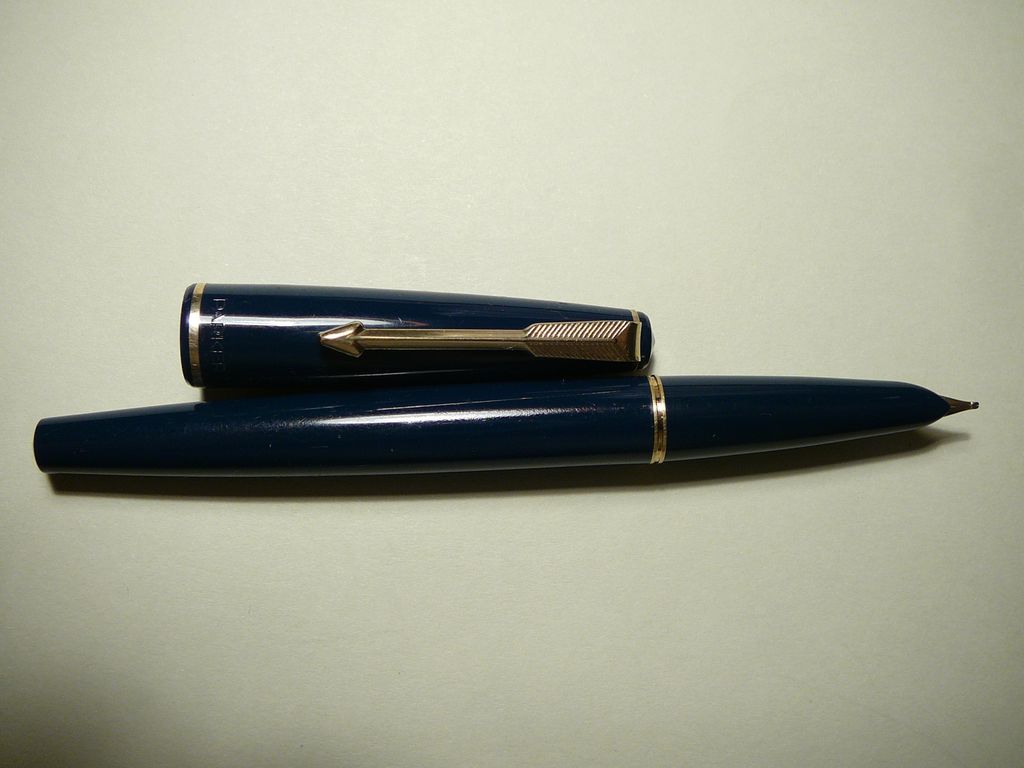 The Parker "17" was introduced in 1962 in two designs, the Parker "17" Duofold and the Parker "17" Super Duofold (ca 137 mm, closed). The former with a thin cap ring and the latter with an unusually wide cap band and a tassie ring/jewel. Both had a slip-on cap, as opposed to the rest of the European Duofold line of the 1960's. They also sported a new style clip with more tapered feathers. The early models also had an open, beak-shaped 14k gold nib. The ends being wider and more pointed than later models, not unlike the Danish Parker Popular of the 1950's.They were offered in the four standard Duofold colours of the time, Black, Blue, Red and Green. These pens also sported metal cap grip-rings on the body. Twist-operated pencils were also offered.