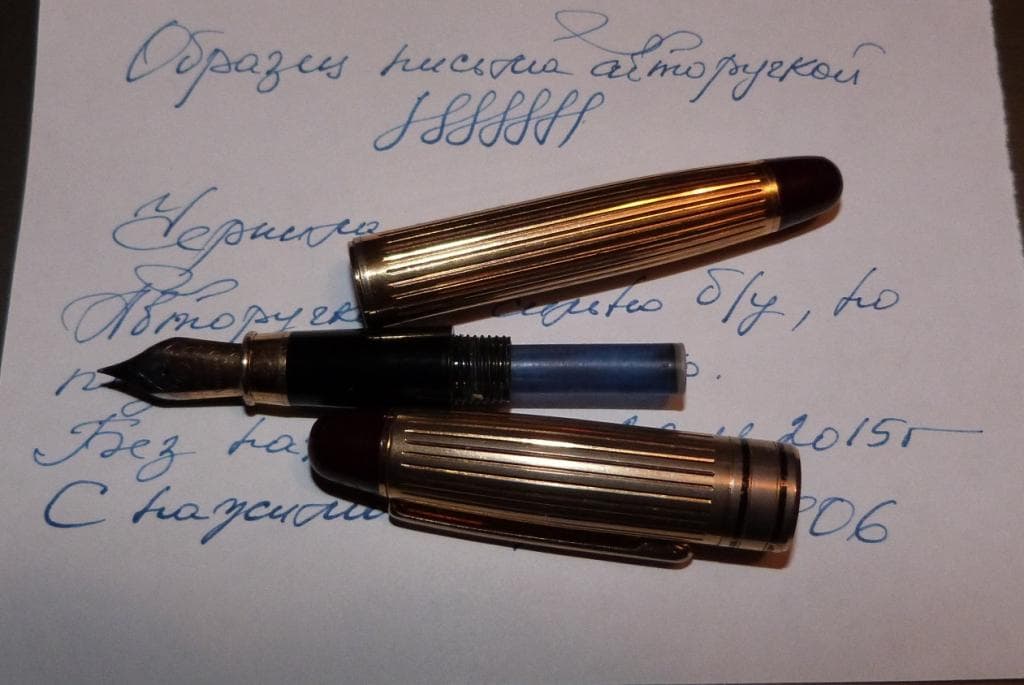 Ручка б/у, (не держит резьба) но, ремонтопригодна. Пишет ОЧЕНЬ мягко и тонко (если без нажима)- одно удовольствие. Перо- iridium pint (F). К перьевой ручке прилагается шариковая - с некритичной царапиной у стержня.