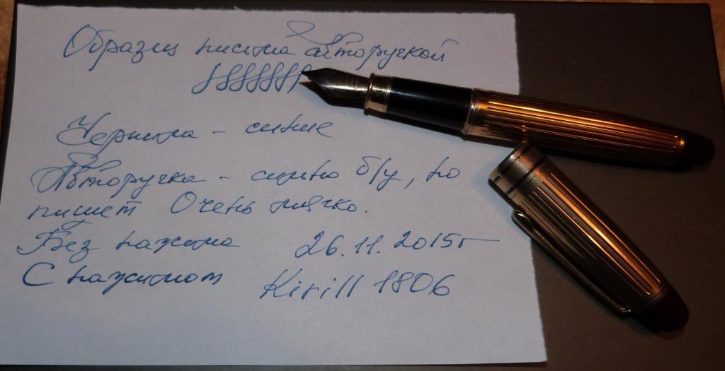 Ручка б/у, (не держит резьба) но, ремонтопригодна. Пишет ОЧЕНЬ мягко и тонко (если без нажима)- одно удовольствие. Перо- iridium pint (F). К перьевой ручке прилагается шариковая - с некритичной царапиной у стержня.