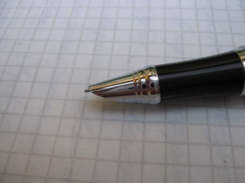 Ко мне попала авторучка, фотографии которой привожу ниже. Ручка, к сожалению, без документов и опознавательных знаков. Пишет изумительно, в одно касание и сразу! Линии тонкие (видимо EF) линия не прерывается даже при еле заметном касании бумаги. Несмотря на тонкое перышко, оно скользит по бумаге исключительно гладко. Перо белого цвета, имеет на кончике не шарик, а продолговатые щечки.