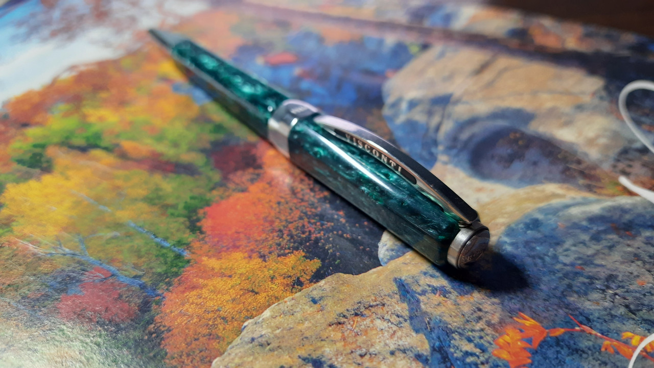 Продаю очень красивую шариковую ручку Visconti Opera. Корпус выполнен из целлулоида шикарного зелёного цвета. Поворотный механизм выдвижения стержня, работает чётко. Стержни паркерского формата (G2). Состояние ручки идеальное.