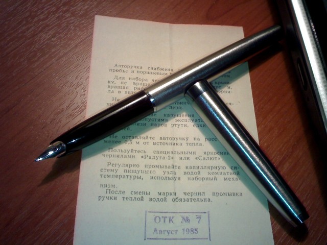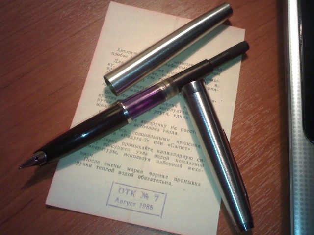 Должен сказать, что ручка пролежала в смазке с 1985 года (об этом мне поведал штамп ОТК в паспорте), была сегодня промыта, сразу заправлена на пробу чернилами Радуга-2 (рекомендация об этом есть в паспорте, кстати) и отлично записала без каких-либо пропусков.