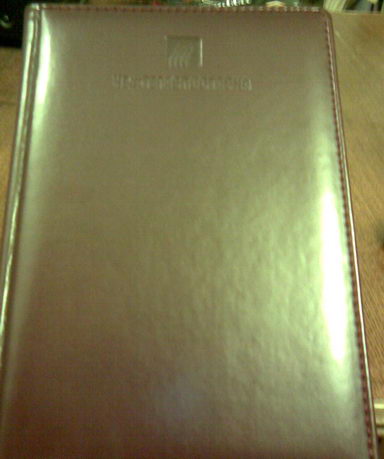 Мне недавно подарили чудный ежедневник Attache. С логотипом компании "нефтегазпоставка". Кожаный, цвет бордо, с кучей всяких справочных материалов. Бумага там, по крайней мере, на ощупь, очень качественная, должно быть, писать в нем будет здорово, как приступлю к записям, напишу впечатления.