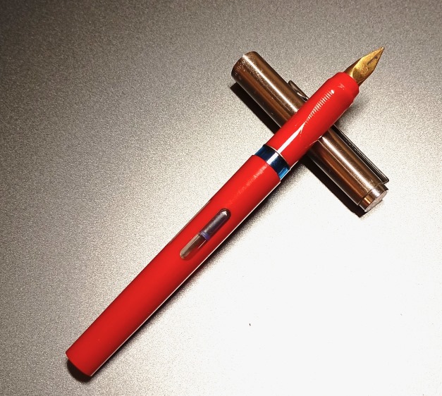В Турции в одном школьном бутике купил навскидку интересный экземпляр перьевой ручки. Не встречал ранее в инете такую форму, с двумя видами окошек контроля чернил: 4 продольных выреза в бареле и прозрачное колечко в грипе.