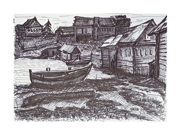 «Лодка на фоне рыбачьего посёлка» — эскиз перьевой ручкой по акварелям художницы Таисии Скородумовой (1958).