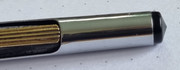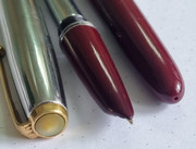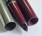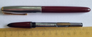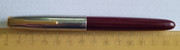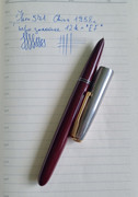 Винтажная китайская ручка Hero 571, Китай, май 1958 года. Корпус бордового цвета, между баррелем и грип-секцией узкое прозрачное окошко для контроля уровня чернил. Колпачок из нержавеющей стали с чередующимися полосками гильоши, золотистый камень в навершии, на колпачке импринт: два иероглифа 英雄 (Герой) и как на ранних ручках импринта "made in China" - нет. Клип позолоченный. Перо золотое 500 пробы ~ "EF", пишет очень тонко и достаточно гладко. На пере импринт 571, что характерно для ранних ручек. Так-же на пере: два иероглифа 英雄, проба золота 12k и дата выпуска 1958 5-.