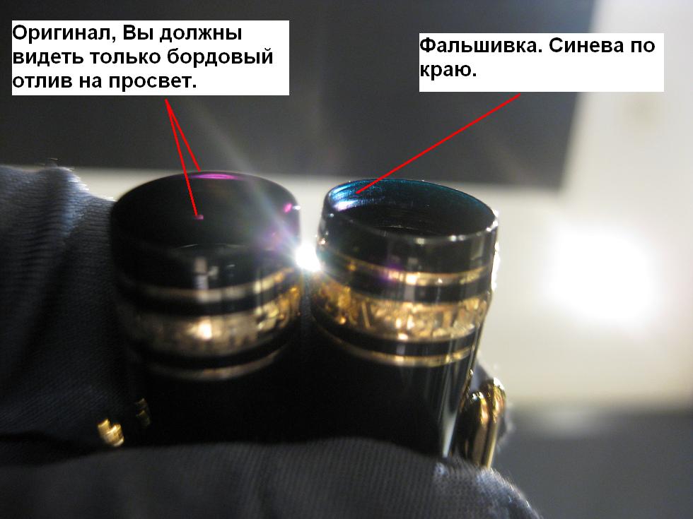 Несмотря на то, что внутренняя поверхность колпачка, на просвет, была "бордоватого" отлива, край колпачка всё же, на просвет, выдал фальшивку синюшным отливом.
