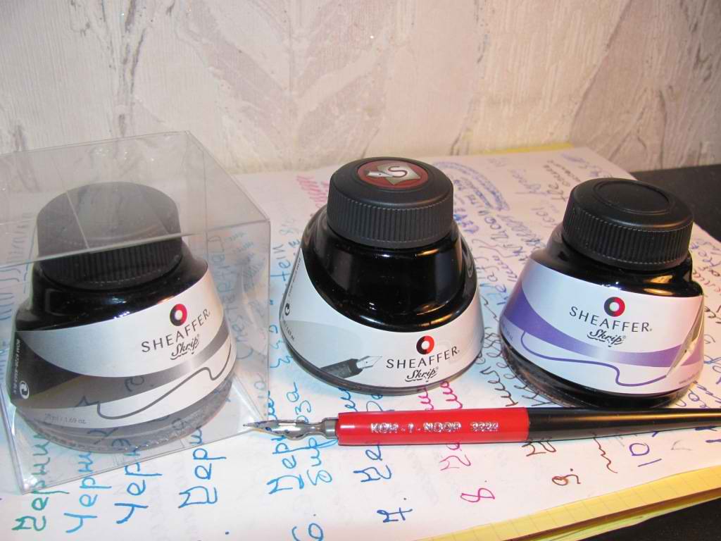 А вот чернила Sheaffer,полученные из Киева.Коричневые довольно симпатичный цвет дают на тонком пере.Есть отличия во внешнем оформлении флаконов.Черные и фиолетовые разлиты в Словакии,коричневые - в США.