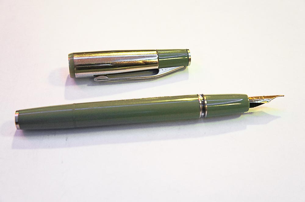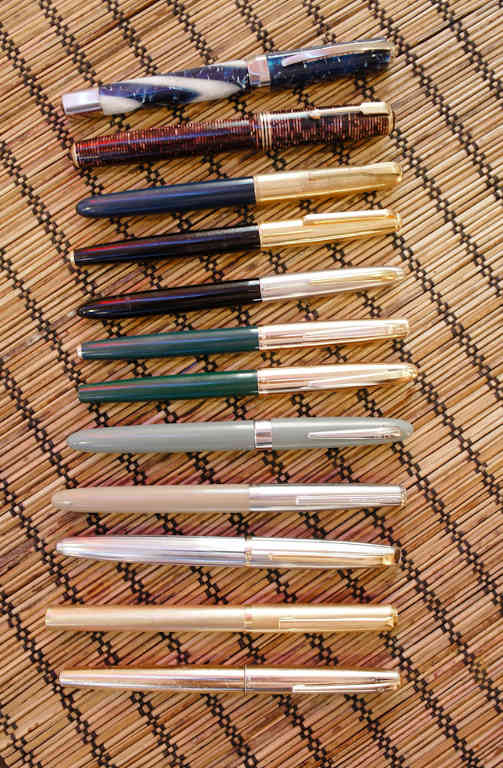 Ученической (Ярославль, 35 коп, заправка - пипетка открытая, середина корпуса - прозрачная пластмасса). Паркер бюджетный. Союз - "акулий плавник". И два китайца. Один - старый, другой новый (сделан именно под этот "старый") - rainbow 201.