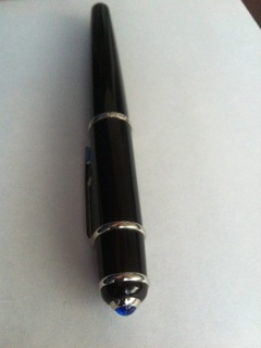 Перьевая ручка, корпус и колпачок из черного композитного материала, палладиевая отделка деталей, кабошон из каучука цвета синего сапфира , покрытого родием, перо из золота 18 карат, была в комплекте коробка с черными чернилами.