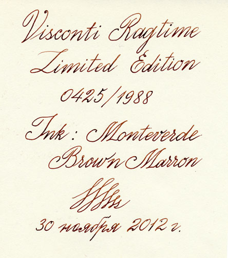 VISCONTI RAGTIME Limited Edition, корпус - драгоценная полупрозрачная смола, отделка - позолота, перо с гравировкой: 20 ANNIVESARY 1988-2008, FIRENZE 14kt 585, F. Система заправки - фирменный пистон-филлер от Висконти увеличенного объема. Колпачок выточен из смолы, на резьбе. В задней части барреля - малый защитный колпачок пистон-филлера, тоже на резьбе. На кольце клипа выгравирован номер: 0425/1988.