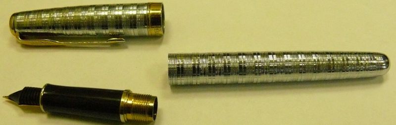 Parker Sonnet , производства Франции, (более детальное название модели, к сожалению, не помню за давностью лет) в хорошем состоянии, использовалась по назначению, потом 2 года лежала в шкафу. В футляре, но без документов. Перо размера F позолоченное, в идеальном состоянии, пишет легко и свободно. Отделка колпачка – позолота. Отделка корпуса ручки – предположительно никеле-палладиевое покрытие либо серебро – точно не знаю (покупал не отделку, а предмет для письма). На золотом пояске колпачка и клипсе имеются потёртости.