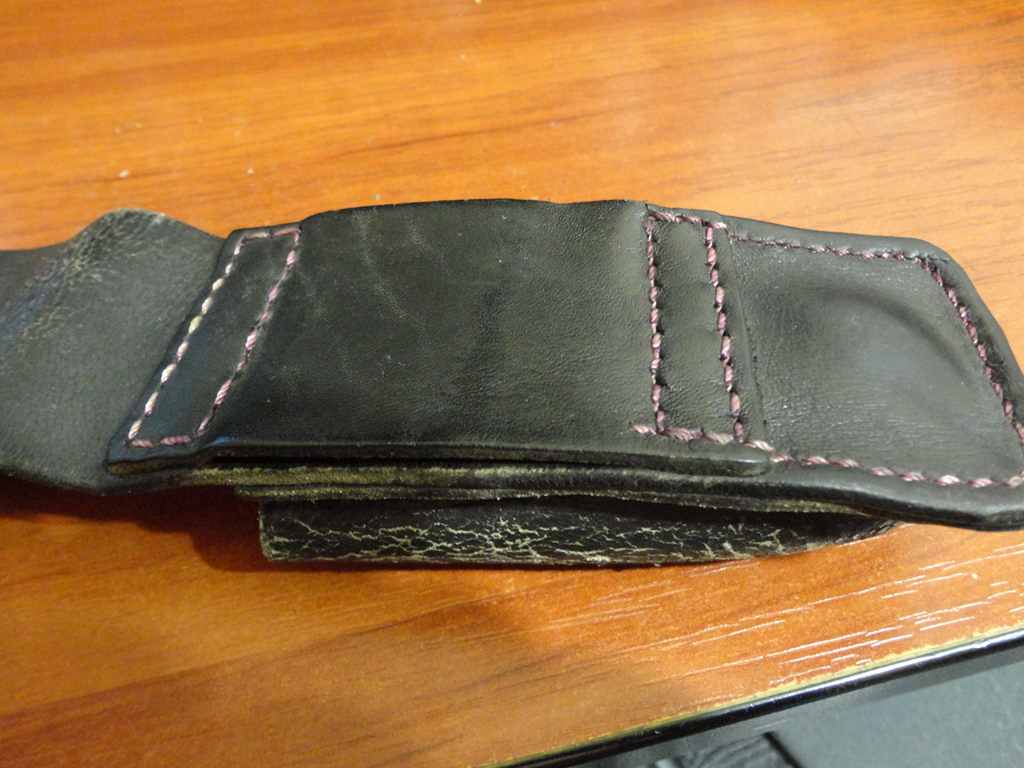 Кожа-кусок от старого чехла для ружья. Лет 10 в гараже валялся, даже трескаться местами начала, потому и страшная Laughing . Нет у меня рядом магазинов торгующих кожей, вот и приходится лепить из кусочков имеющихся в наличии. Ничего, подправим, подкрасим, за первый сорт сойдет Wink