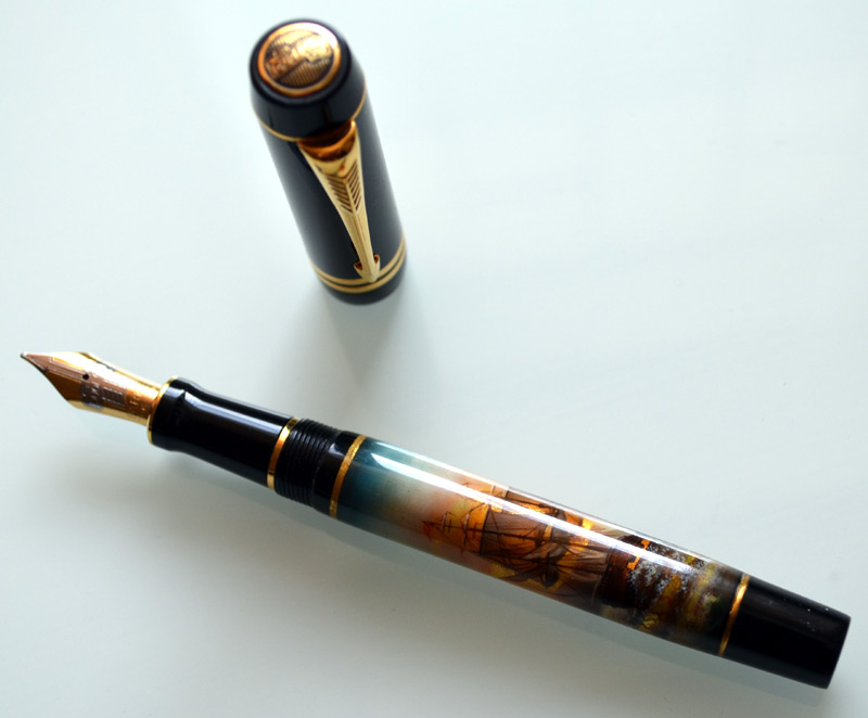 Продаю перьевую ручку Parker Duofold Centennial (перо М, полный комплект), существующую в единственном экземпляре. Корпус ручки украшает выполненная вручную миниатюра в стиле Айвазовского, представляющая парусник, борющийся с морской стихией. Некоторые форумчане могли видеть эту ручку на наших встречах.