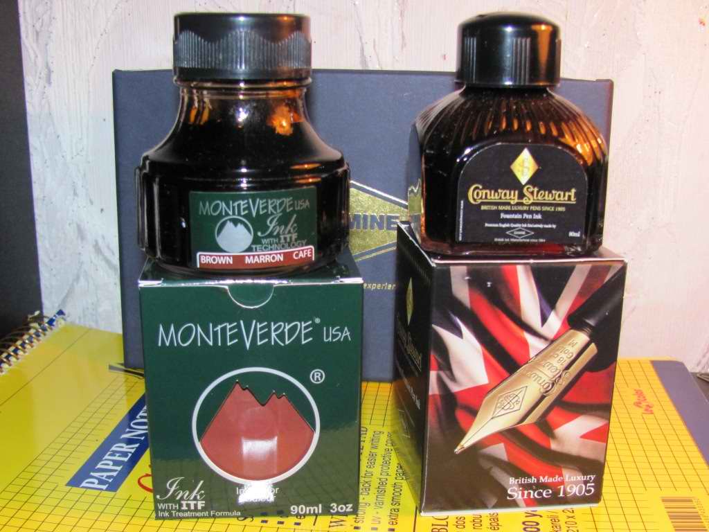 Пополнение собрания - дочка,зная о моём hobby,подарила те чернила,которых не было. О Visconti не раз уже писалось на форуме,хорошие чернила.Monteverde - изготавливаются в Австрии,американцы лишь разливают в свои флаконы на 90 мл.J.Herbin - пока не открывал,о них у нас есть отдельная тема.