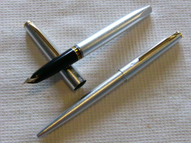Продам комплект "Алюминиевый": перьевая авторучка с золотым пером и шариковая ручка нажимного типа!