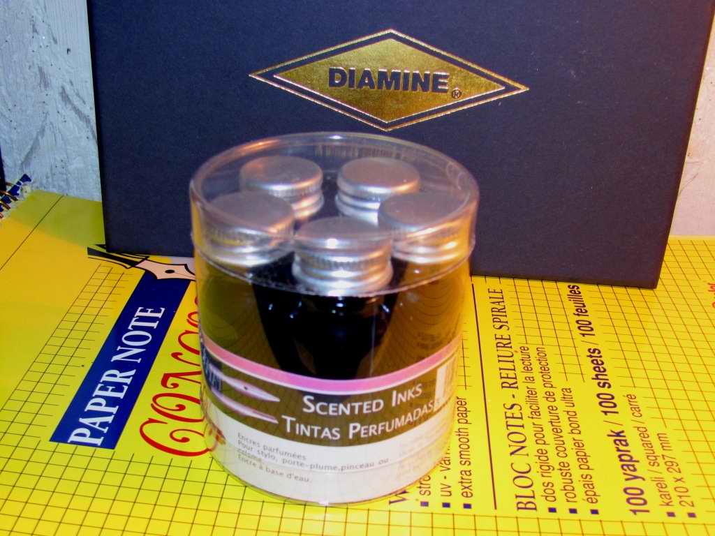 Новые чернила Conway Stewart Kingsand Brown,выпущенные совместно с Diamine, мне понравились,сейчас ими пишу.Цвет - серединка между Diamine Chocolate Brown и Sheaffer Brown, но мне они показались более маслянистыми,пишут более гладко,чем Diamine. Ну, и серия Diamine Music Set. Красивая упаковка, о чернилах пока ничего сказать не могу - не вскрывал.