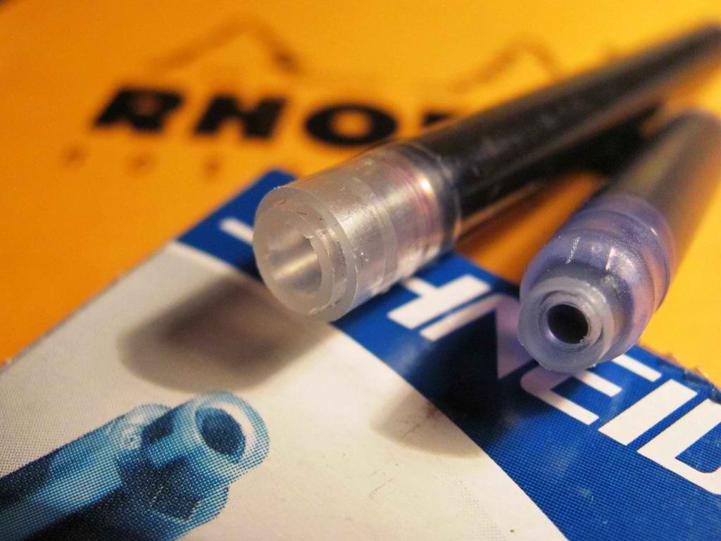 А сделать переходник П - И ещё проще. Отрезаем горлышко у И по порожек, прокалываем клапан у П и надеваем горлышко. Всё работает. Примечание: перед письмом нужно убедиться, что чернила поступили в переходник. Для этого можно тряхнуть ручку.