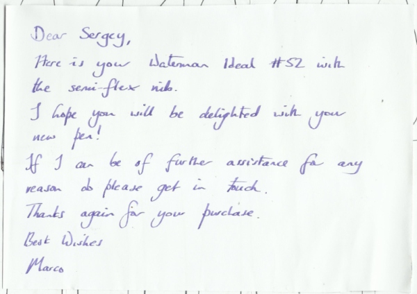 Запаковывал вчера parker 51 на отправку и взял в качестве контейнера, чтобы почта не раздавила, старую трубочку, в которой ~1,5 года назад пришла другая ручка. Обратил внимание, что вокруг трубки какая-то бумажка обернута. Оказалось, это продавец мне тогда написал.