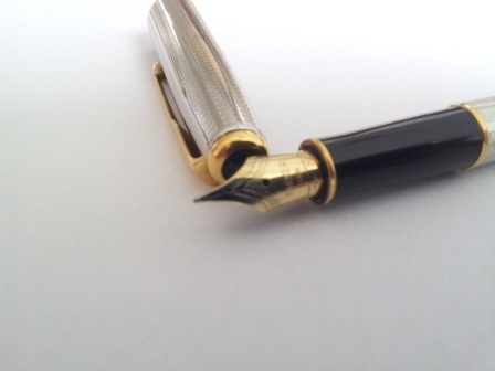 Доброго времени суток! Предлагается к вниманию перьевая ручка Parker Sonnet Cascade Silver. Перо золотое 18К 750, размер - XFine, посеребренный корпус. Состояние очень хорошее - сколов, царапин, повреждений не обнаружено. Оригинал, ІІ Р - то бишь выпуск 1997 года. Сейчас таких экземпляров уже не производят, тем более с таким пером. Субъективные впечатления от письма хорошие, перо гибкое и соответственно размера мягкое. Толщина линии зависит от силы нажима, чернила не льёт (см. фото образца письма).