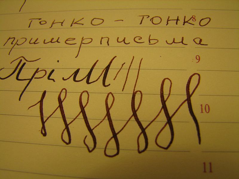 Не теряя времени я заправил ручку чернилами PR Chocolat и принялся исписывать один за другим листы разной бумаги. Результат превосходный - Мартин постарался на славу! Письмо исключительно гладкое и тонкое. Линии равномерные, а подача чернил просто безукоризненная. Перо весьма упругое. Если писать совсем без нажима, то перо оставляет равномерную и тонкую как паутинка линию. Если слегка увеличить нажим, то толщина линии плавно и предсказуемо увеличивается в десятки раз. Красота!