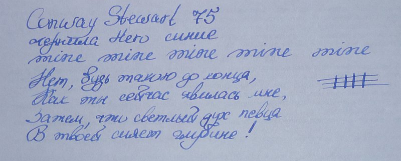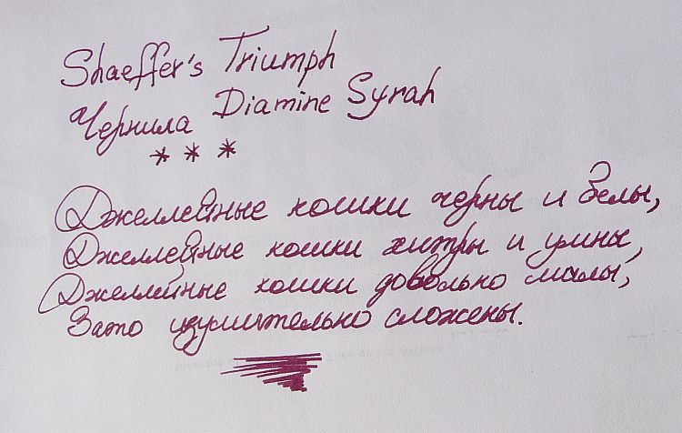 С чернилами Diamine (другие пока не пробовал) ручка пишет насыщенно, при этом не «переливает». Кстати чернила очень «нарядные» и при письме линия «играет» оттенками.