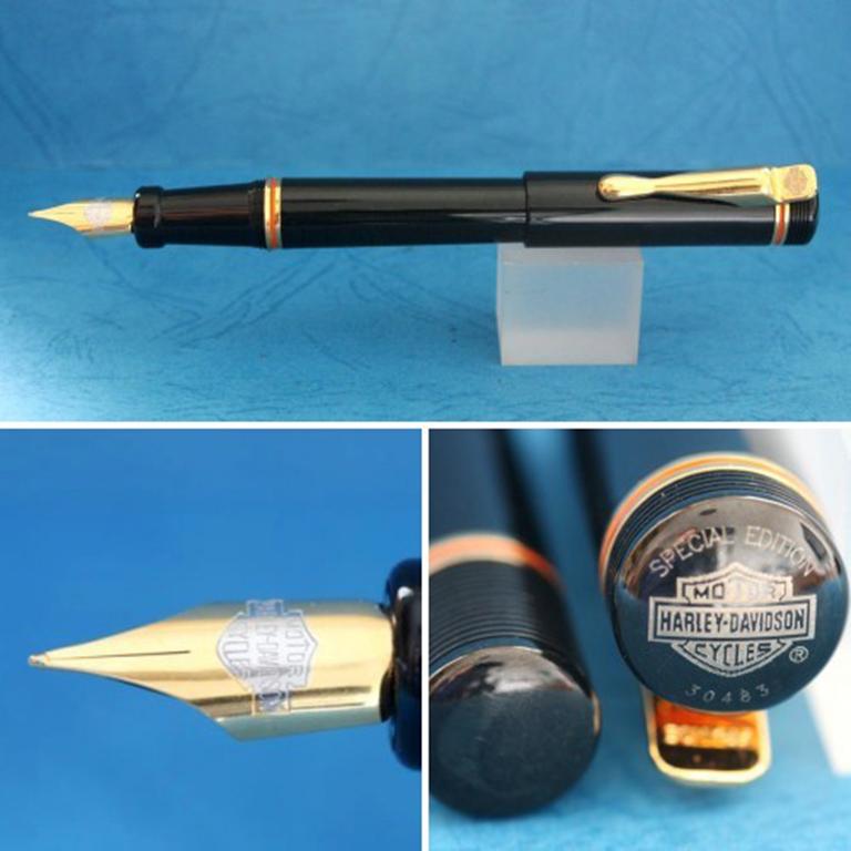 Довольно солидная и строгая форма,отделка хромом металлических частей баррела и колпачка,оригинальная и весьма удобная конструкция клипа с подпружиниванием,выточенные канавки,в которые вставлены 3 резиновых кольца оранжевого цвета (основного цвета логотипа американской компании) - всё это придаёт перьевым и шариковым ручкам этой модели великолепный вид, эти ручки никак не спутать с другими. На двухтоновом пере,вершине колпачка и на клипе лазером нанесён логотип компании.Каждая ручка имеет свой серийный номер,который виден на колпачке.Сколько всего было выпущено ручек я затрудняюсь ответить,но учитывая то,что одна из моих ручек имеет номер 2279806,можно сделать вывод - выпустили их не просто много, а очень много,думаю около 3-х миллионов.Впрочем,это неудивительно.Большое разнообразие цветового оформления корпуса,различное покрытие колпачка и баррела (лак,резина,кожзаменитель) наверняка полностью удовлетворили "вкусовые" предпочтения любителей ручек и поклонников американских мотоциклов. Перо выпускалось европейского формата "М",подача чернил - среднеобильная и стабильная."Шарик" пера отшлифован добротно,писАть перьевой ручкой очень приятно. Колпачок на резьбе,система заправки - картридж international. У шариковой ручки механизм поворотного типа,стержень объёмный формата "Parker". Вес перьевой ручки в сборе 33 грамма,без колпачка - 18 грамм, хорошо сбалансированна,в руке удобна, можно использовать ручку при письме как с надетым колпачком,так и без оного.