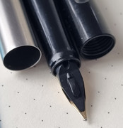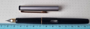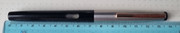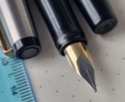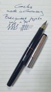 Geha made in Germany 70-80-е годы. Корпус из черной смолы. В барреле два продолговатых окошка для контроля уровня чернил. На торце барреля импринт - made in Germany. Колпачок из нержавеющей стали, на защелке. Клип позолоченный, импринт - Geha . Система заправки, картридж. Перо позолоченное, двутоновое ~ M, импринт - Geha. Пишет очень гладко и мягко. Ручка в отличном состоянии.