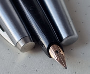 Корпус из сатинированной, хромированной латуни. Колпачок на трении. На колпачке, под клипом лого завода. Система заправки, встроенный конвертер. Перо золотое 583 пробы. Состояние NOS.