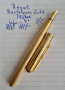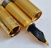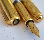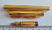 Regal, Тайвань, 80-90-е. Корпус из позолоченной латуни, с отделкой Barleycorn (ячменное зерно). Колпачок на защелке, фиксируется мягко и надежно, с приятным звуком. В навершии колпачка вставка с логотипом фирмы Regal Curio Enterprise Co., Ltd. На клипе так-же логотип фирмы Regal. По краю колпачка широкое кольцо с орнаментом, покрытое более светлым тоном позолоты, ниже импринт - Regal. На боковой поверхности колпачка, чистый картуш. Система заправки картридж/конвертер internatijnal. Перо стальное позолоченное IPG, пишет тонко, гладко и мягко.