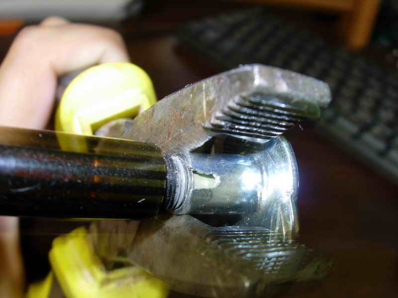 Поскольку такого девайса не имею, а разобрать ручку надо, пришлось подключать серое вещество и его извилины. Дотумкал. Берем металлический дюбель под резьбу М10 (стандартный, с четырьмя штырьками, которые обычно входят в гипсокартон и не дают дюбелю проворачиваться). Диаметр хоть и совпадает, но резьба дюбеля имеет слишком крупный для ручки шаг, поэтому впоследствии надо будет обработать внутреннюю часть с резьбой напильником. Штырьки сразу загибаем, чтобы не мешались. Делаем с торца надпил надфилем на полсантиметра вглубь. Слегка спиливаем резьбу, чтобы этот "съемник" налезал на резьбу ручки не внатяг (не деформировал). Обхватываем плоскогубцами как показано на рисунке и выкручиваем. В том месте, где делали надпил дюбель сжимается и потому выкручивается вместе с втулкой, вкрученной в ручку.